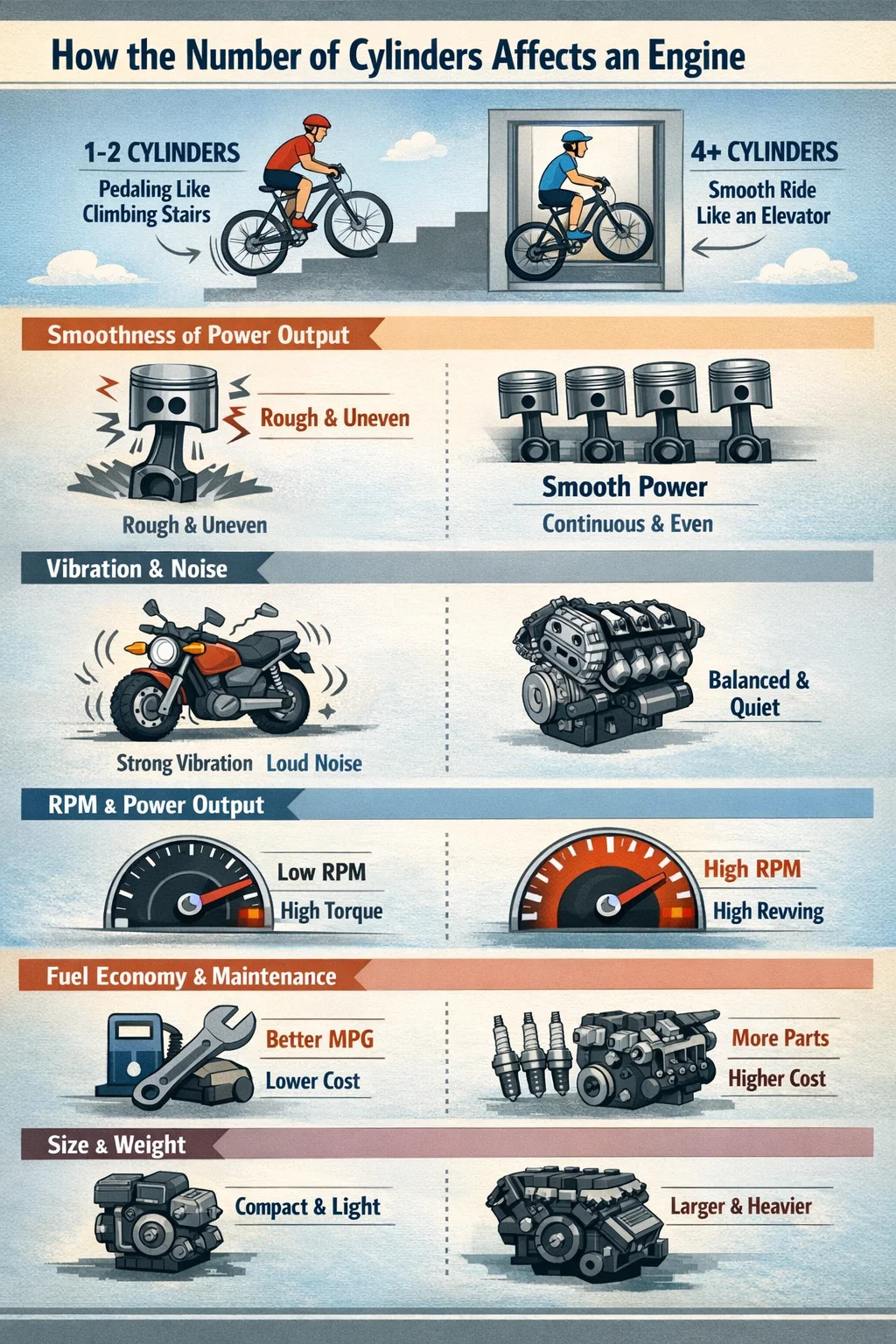 Jumlah silinder rendah (1-2 silinder): Seperti menaiki tangga; Anda bisa merasakan "sensasi mengayuh" yang berbeda. Mesin jenis ini memiliki tenaga yang baik pada RPM rendah, namun keluaran tenaganya terasa berdenyut-denyut dan tidak terlalu kontinyu.