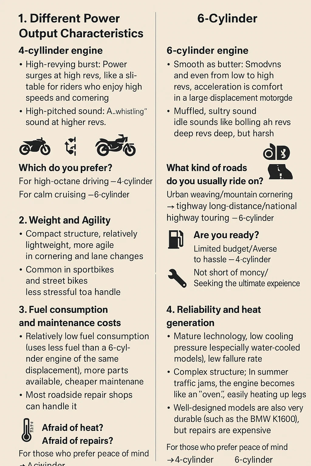 Memilih antara mesin 4 silinder dan 6 silinder untuk sepeda motor Anda bergantung pada pilihan penggunaan dan gaya Anda. Berikut perbandingannya: