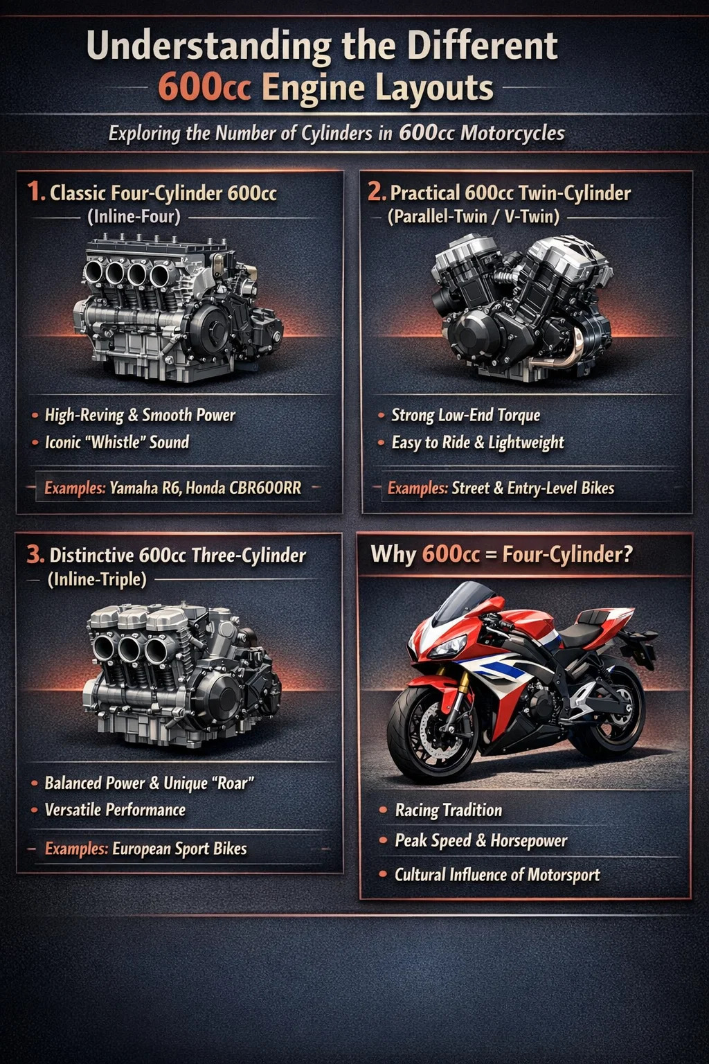 "600cc" mewakili perpindahan mesin (total volume seluruh silinder), seperti total luas sebuah rumah. Jumlah silinder mengacu pada tata letak ruangan. Dalam kelas perpindahan 600cc, "desain ruangan" sangat beragam.