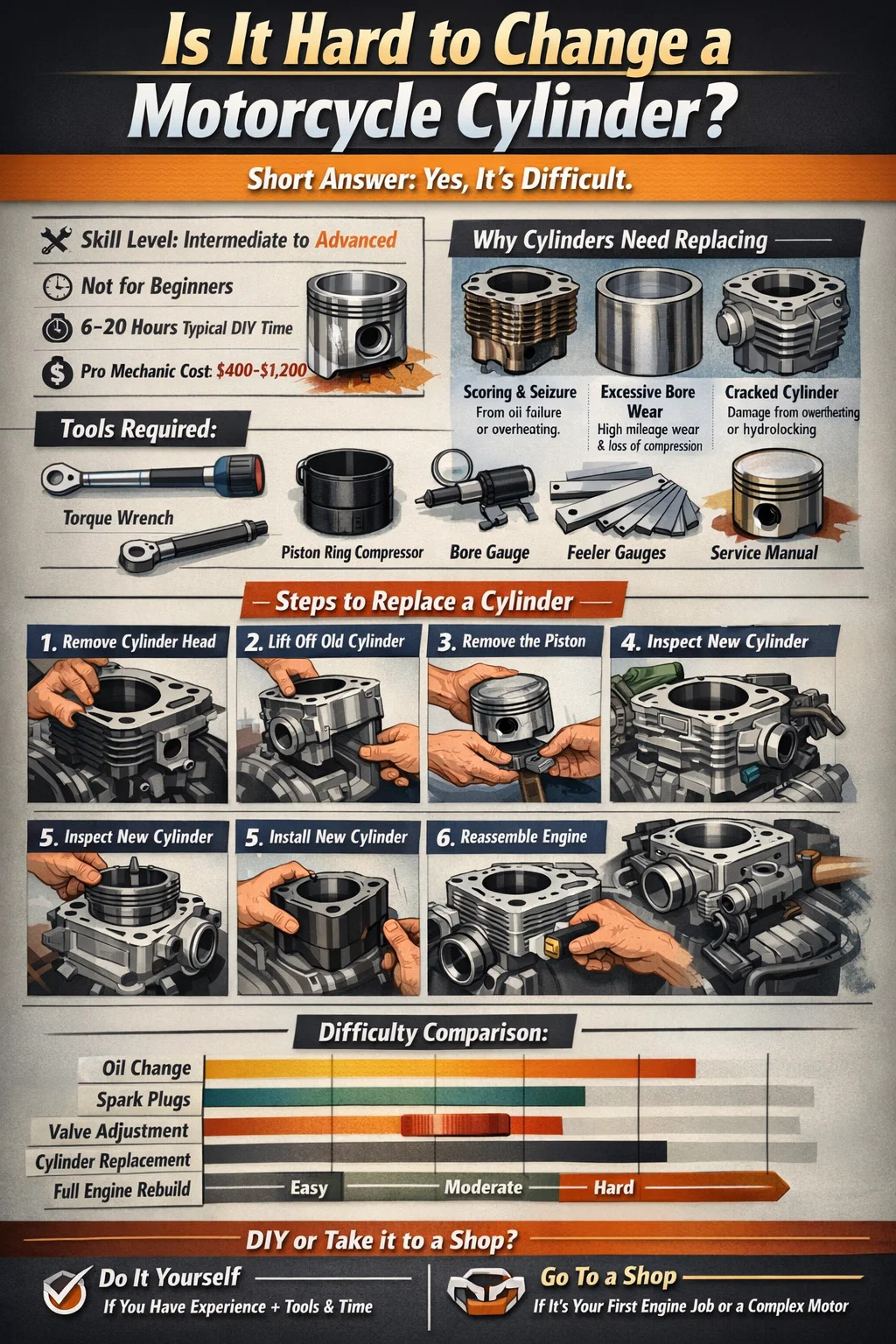 Mengganti silinder sepeda motor adalah cukup sulit hingga sangat sulit tergantung pada konfigurasi mesin sepeda Anda, pengalaman mekanis Anda, dan peralatan yang Anda miliki. Ini bukanlah pekerjaan tingkat pemula. Bagi sebagian besar pengendara yang tidak memiliki pengalaman membangun kembali mesin sebelumnya, prosesnya dapat dilakukan kapan saja 6 hingga 20 jam tersebar di beberapa sesi. Seorang mekanik profesional biasanya mengenakan biaya antara $400 dan $1,200 tenaga kerja sendirian, yang memberi Anda gambaran tentang kompleksitas yang terlibat.