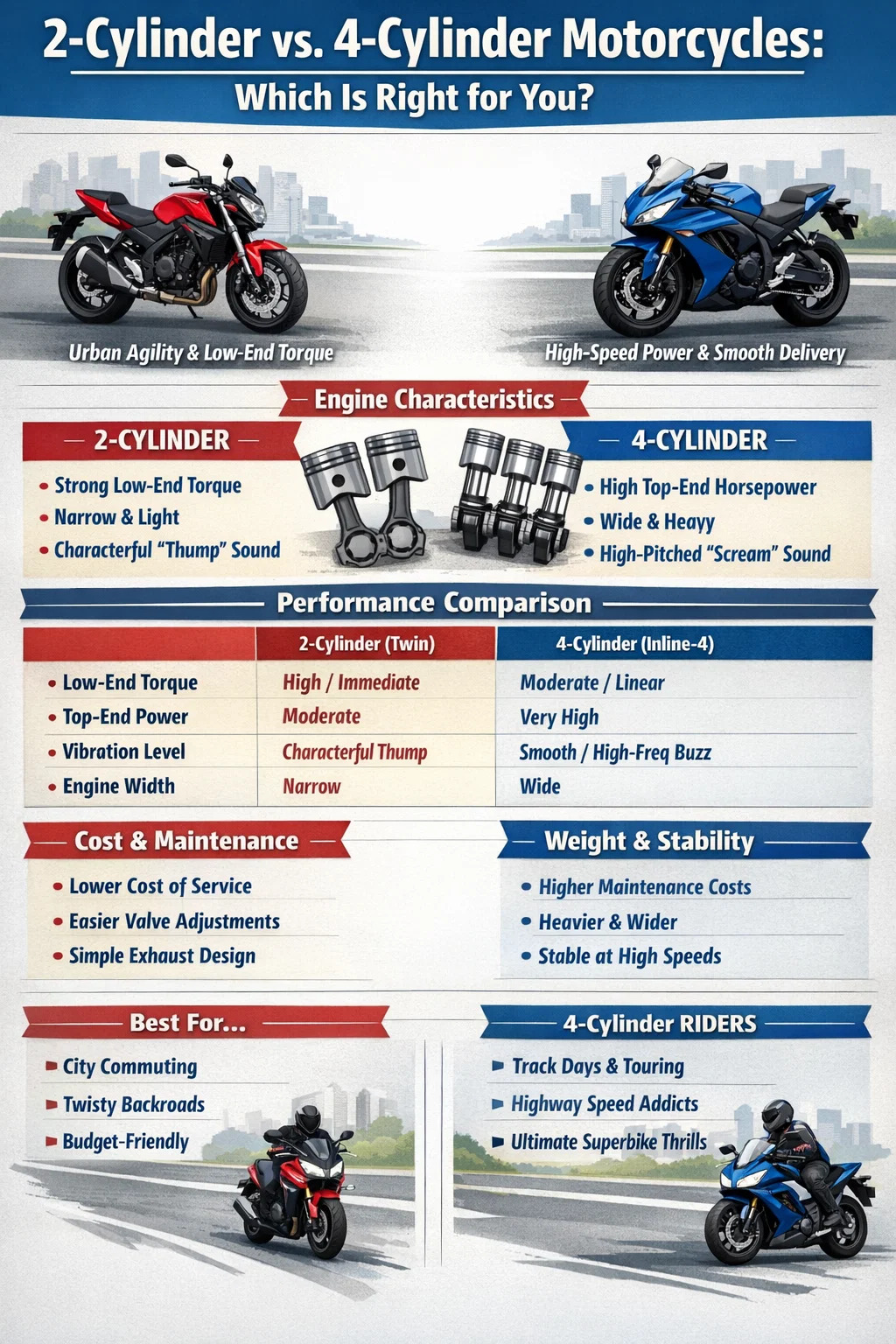 Perbedaan mendasarnya terletak pada cara mesin bernafas dan bergerak. dalam sebuah pengaturan 2 silinder (seringkali Parallel-Twin atau V-Twin), masing-masing individu silinder sepeda motor lebih besar. Piston yang lebih besar memiliki massa yang lebih besar dan langkah yang lebih panjang, yang menghasilkan torsi yang sangat besar pada RPM rendah. "Mendengus" ini memungkinkan Anda menjauh dari lampu lalu lintas dengan penuh wibawa tanpa perlu menari di atas pemindah gigi.